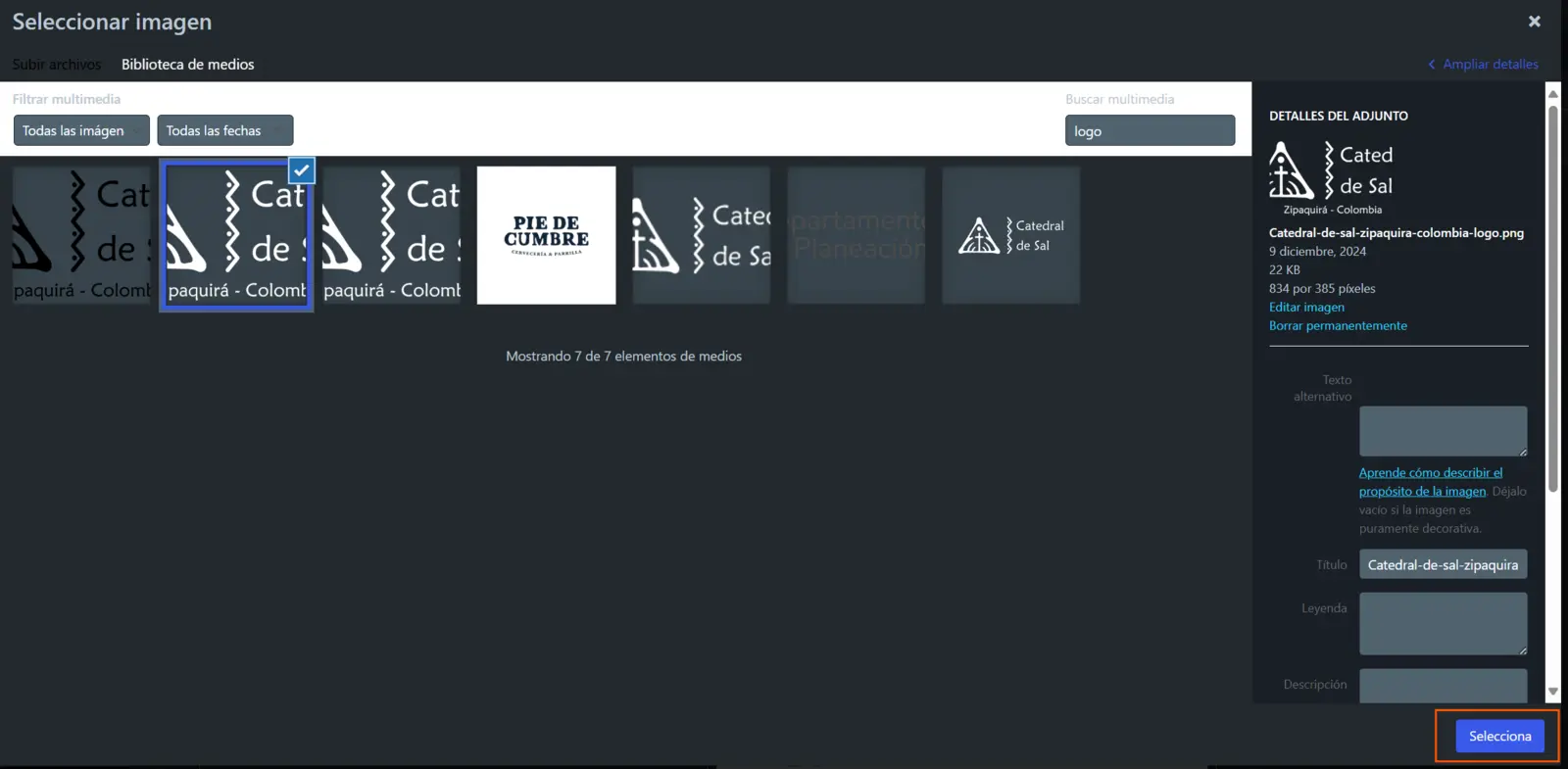 Si seleccionas la opción Logo del sitio, será de forma convencional, seleccionar una foto en png, jpg y etc. Para mantener la ejecución del sitio mas optimizada posible, subiremos no solo el logo en formato WEBP sino que todas las imagenes deben estar en formato WEBP o SVG dependiendo el caso como veremos en mas adelante.