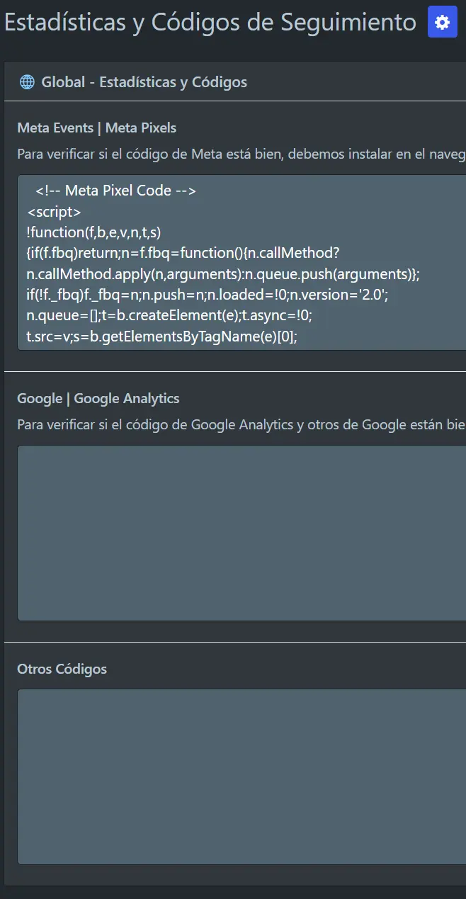 En esta sección añadiremos unicamente los codigos de seguimiento de Meta, Google y otros servicios que tengan este apartado.