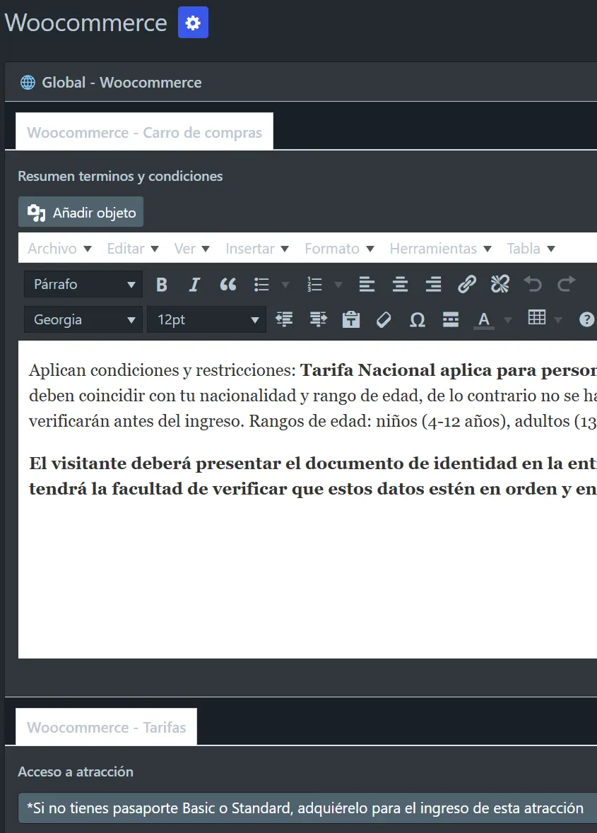 Nos vamos a encontrar con 2 simples campos que "Resumen terminos y condiciones" se ubica en la pagina del carrito de compra y "Acceso a atracción" se ubica en el producto individual de Tarifas, ese texto se agrega a sea cual sea el producto individual mostrado.